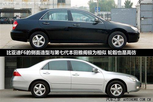 在外觀上,比亞迪F6最具代表性的模仿之處在于側面,因為它與第七代本田雅閣極度相似,而且連輪轂的造型也如出一轍,其實真的不用模仿得這么細致。F6的尾燈與奔馳S級的非常神似,不敢說完全模仿,但借鑒之處還是能看得出來的。