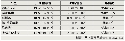 通過上表我們可以看出,六款車型在售價方面都有不同程度的下浮。其中以嘉華、福特S-MAX和威麟V5為首的大幅度降價車型,降價幅度都達到了2萬元以上。第3代閣瑞斯獨領(lǐng)一萬元降價區(qū)間,馬自達5和途安這兩款更為熱銷的車型,由于關(guān)注度較高,現(xiàn)車也較為緊張,優(yōu)惠幅度也僅有5千元和8千元的小幅度降價優(yōu)惠。