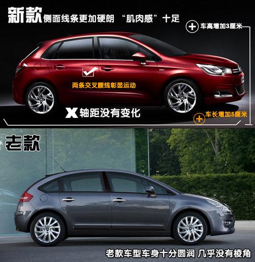 一般意義上來說,區(qū)別一款車型是不是小改款車型主要看是否只是改動了車身前后的造型。而全新的雪鐵龍C4的絕對可以稱得上新車,通過車身側(cè)面的對比我們可以清楚的看到,在C柱部分已經(jīng)進(jìn)行了重新設(shè)計,而側(cè)面不對稱的交叉腰線在彰顯了個性的同時也提升了整車造型的質(zhì)感。