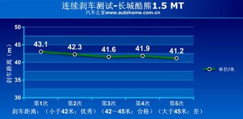 除了出色的乘坐和儲(chǔ)物空間,酷熊的動(dòng)力和經(jīng)濟(jì)性也有不錯(cuò)的表現(xiàn),從其連續(xù)制動(dòng)的工況圖中可以看出,酷熊的平均制動(dòng)距離在42米左右,且剎車系統(tǒng)的穩(wěn)定性也比較強(qiáng)。而在油耗測(cè)試中,6.7L/百公里的成績也低于我們的預(yù)期。