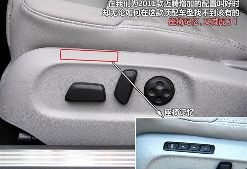 不過必須批評的是邁騰一方面在積極的增配,改善用戶體驗(yàn),另一方面還不忘簡配,之前出現(xiàn)在舒適型和豪華型上的座椅記憶功能在2011款全系中都被簡配掉了。