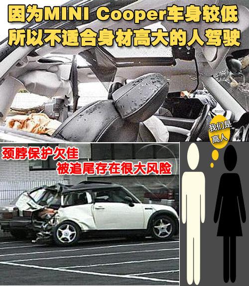 因為身材高大的消費者朋友在駕駛時會覺得空間有些局促,這就對個人的安全埋下了隱患。特別是并不寬裕的頭頂空間,在不幸發(fā)生了嚴重的追尾事故時,對車上乘員的保護將十分有限。臺灣女星許瑋倫就是在自己的MINI Cooper中不幸被貨車追尾,傷其頸部搶救無效死亡。