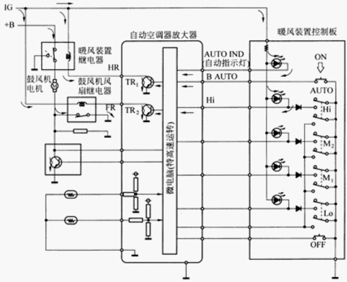 。1)鼓風機轉速控制?照{系統(tǒng)ECU根據(jù)設定的溫度、車內現(xiàn)有溫度、車外溫度、陽光強度、蒸發(fā)器皿溫度等信號,發(fā)送不同的指令給鼓風機電機,并使之搭鐵,從而控制不同的鼓風機轉速。對于一些恒溫空調系統(tǒng),當發(fā)動機啟動時或冷卻液溫度低于預定值,空調系統(tǒng)ECU使鼓風機不起作用。