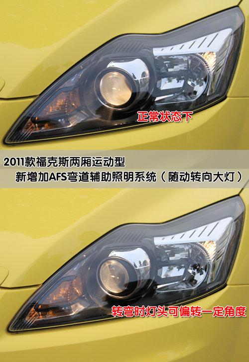 2011款?怂箖蓭\(yùn)動(dòng)型在安全配飾上新增加了AFS彎道輔助照明系統(tǒng),AFS是彎道輔助照明系統(tǒng)的縮寫(xiě)(俗稱(chēng)彎道大燈)。AFS系統(tǒng)有三種形式:1、轉(zhuǎn)向頭燈形式的,就是頭燈內(nèi)燈具可以左右旋轉(zhuǎn)8°至15°照明彎道死角。 2、利用獨(dú)立彎道照明系統(tǒng)的,就是在燈具里有一個(gè)固定的燈泡照向彎道,轉(zhuǎn)彎時(shí)候自動(dòng)點(diǎn)亮。3、利用左右霧燈進(jìn)行彎道時(shí)候照明,轉(zhuǎn)向時(shí)候?qū)?yīng)彎內(nèi)側(cè)霧燈亮起,照明彎道死角。而2011款?怂箖蓭\(yùn)動(dòng)型采用的是第一種形式,增強(qiáng)了夜晚行車(chē)的安全性。