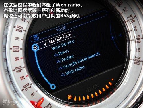 這套系統(tǒng)中整合了GPS導(dǎo)航、音響多媒體、車輛信息設(shè)置等諸多功能,最有特點的是其中MINIConnected這項功能,有了這套系統(tǒng),你可以將自己的蘋果iphone放入中央扶手,并與整套車載系統(tǒng)連接,可以延伸出更多的拓展功能,在試駕過程中我們體驗了Web radio、谷歌地圖搜索等一系列創(chuàng)新功能,據(jù)說還可以接收用戶訂閱的RSS新聞。目前這套系統(tǒng)是否會裝備在進入國內(nèi)的MINICountryman上我們還不得而知,但相信這種集成式的多媒體系統(tǒng)會是今后的發(fā)展趨勢。