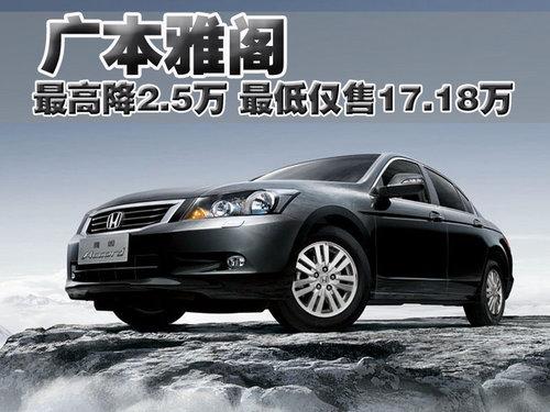 當(dāng)提到中級(jí)車型大家也許會(huì)不約而同的想起廣本雅閣,新雅閣憑借其大氣的外觀、舒適的空間和豪華的配置對(duì)于中級(jí)轎車市場的構(gòu)成起到了舉足輕重的作用。去年,廣汽本田又對(duì)第8代雅閣進(jìn)行了小改款,對(duì)原來車型的配置有一定程度提升,部分車型增加了智能鑰匙和后遮陽板等配置,提高了雅閣整體車型的性價(jià)比。近日根據(jù)網(wǎng)上車市價(jià)格監(jiān)測系統(tǒng)顯示,目前雅閣現(xiàn)金最高優(yōu)惠2.5萬元,最低售價(jià)逼平17萬。具體價(jià)格以及優(yōu)惠幅度如下: