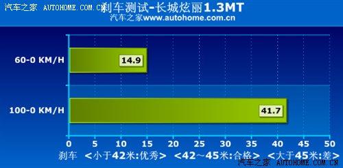 長城汽車的剎車一直得到較高的評價,我們對1.3L車型進(jìn)行的剎車測試中,車輛全力剎車,車速從100-0KM/h的最短制動距離為41.7米,系統(tǒng)的穩(wěn)定性處于中等水平,剎車成績還是不錯的,我們比較滿意。