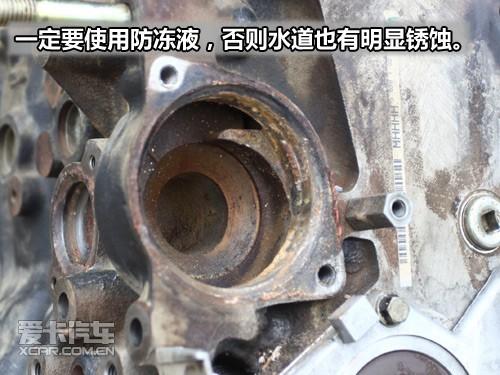 長期使用水而不使用防凍液會腐蝕水泵葉輪,尤其是金屬葉輪腐蝕最為嚴(yán)重。此外,水箱也會被水垢腐蝕造成管路堵塞,圖上這個腐蝕的情況是一般情況,更為嚴(yán)重的是葉輪已經(jīng)徹底被腐蝕掉,散熱系統(tǒng)降低造成水溫過高而經(jīng)常開鍋。