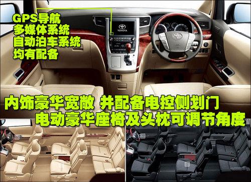 在配置方面,豐田Alphard高配版配備了電動控制的側(cè)滑門、中置式大型電動天窗、內(nèi)置GPS導(dǎo)航及硬盤的多媒體系統(tǒng)、6碟DVD/CD影音系統(tǒng)帶8喇叭、自動泊車系統(tǒng)、前后泊車?yán)走_(dá)。車廂內(nèi)飾則提供了米色與黑色兩種內(nèi)裝顏色供用戶選擇。
