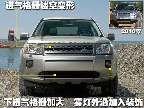 2011款神行者2相比2010款前臉變化不是特別大,沒有加入流行的Led日間行車燈,首先是進(jìn)氣格柵的鏤空孔的形狀發(fā)生了改變,下進(jìn)氣格柵由原來方正的造型變成了大嘴的造型,另外在圓形霧燈的外沿加入了塑料裝飾,呈現(xiàn)出了比較方正些的造型。