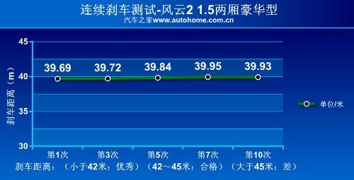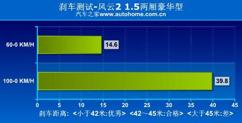 我們對風(fēng)云21.5L兩廂豪華型進行的性能測試中顯示,從100KM/h全力制動到車輛靜止,剎車距離為39.8米,成績非常出色;剎車踏板回饋力較大,所以在剎車時需要使用更大力氣,在日常駕駛中踏板的余量偏大,不過一旦深踩,制動效果明顯。