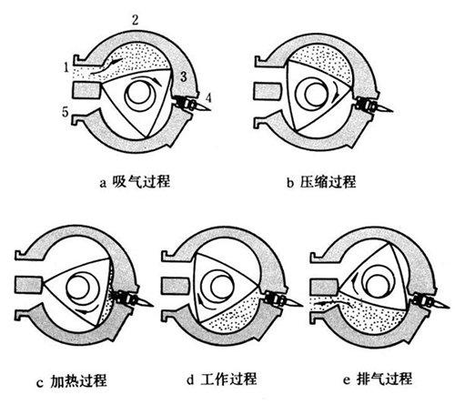 工作原理上:在三角轉子轉動時,以三角轉子中心為中心的內齒圈與以輸出軸中心為中心的齒輪嚙合,齒輪固定在缸體上不轉動,內齒圈與齒輪的齒數之比為3:2。上述運動關系使得三角轉子頂點的運動軌跡(即汽缸壁的形狀)似“8”字形。三角轉子把汽缸分成三個獨立空間,三個空間各自先后完成進氣、壓縮、做功和排氣,三角轉子自轉一周,發(fā)動機點火做功三次。而轉子發(fā)動機的轉子每旋轉一圈就作功一次。