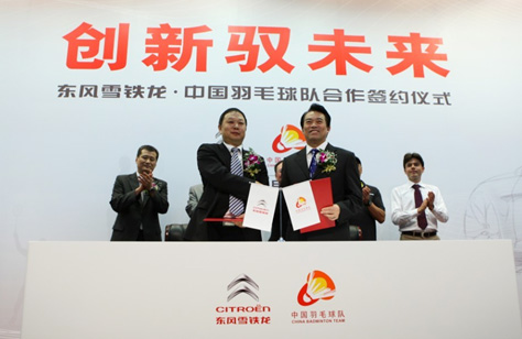 東風(fēng)雪鐵龍副總經(jīng)理魏文清與國家體育總局乒羽中心主任、中國羽毛球協(xié)會(huì)副主席劉鳳巖簽署合作協(xié)議