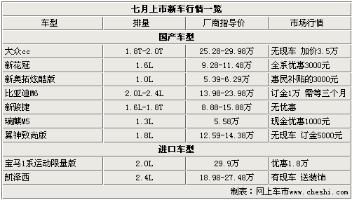 7月份上市的新車型中聚集了眾多知名大品牌。如一汽大眾、鈴木、一汽豐田等。而按照車型細分,其中涵蓋各個級別的車型,其中自品牌有3款車型上市,分別是比亞迪M6、新駿捷;瑞麟M5;合資車型包括一汽大眾CC、、三菱翼神、新花冠,進口車型鈴木凱澤西和寶馬1系運動限量版,共計9款車型。