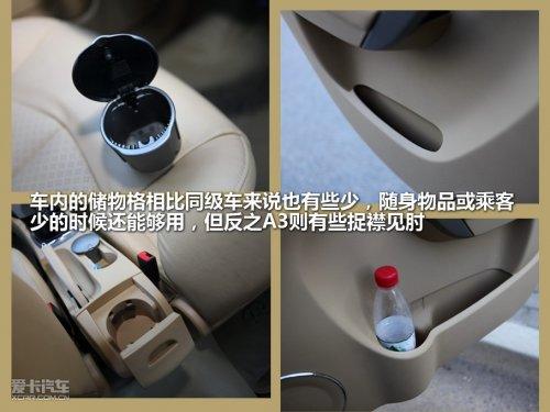 車內(nèi)的儲物格相比同級車來說有些少,移動煙灰缸占用了一個杯架,手機、煙盒等等則占用了另一個,而杯架真正的主人只能放在車門上了。其方向盤左側提供了一個儲物格,只是這個儲物格開開關關的實在不方便,所以只能放洗車卡之類的不太常用的東西。也許這么看A3的儲物格夠了,可是如果隨身的東西再多一些,A3的儲物空間就捉襟見肘了。