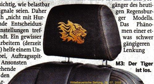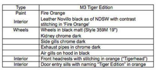 外觀方面,M3 Tiger特別版的進氣格柵、反光鏡邊緣都使用了黑色,而車輪部分也升級為寶馬的359M系列(16輻)運動化鍛造黑色19英寸輪轂,配合銀色的鍍鉻排氣管。內(nèi)飾部分,M3 Tiger紀念版的內(nèi)飾為黑色真皮坐椅,對應火焰橙的走線。