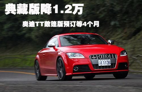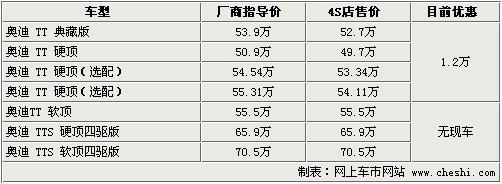 據4S店銷售人員介紹:目前奧迪TT已上市的典藏版車型店 內有現車,售價為53.9萬元,TT標準版車型有現車,售50.9萬元,但還有2款在50.9萬元基本款車型上增配車型,分別售54.54萬及55.31 萬,以上這4款車型都可優(yōu)惠1.2萬元,車身顏色共有白色、紅色、銀色及日光橙色供挑選。奧迪TT典藏版相對在售TT車型不同的是,這款車配以橘色車身及 運動套件,車內車外都進行運動改裝,看起來十分漂亮。如需預定TT及TTS其他顏色及車款,需等待4-6個月時間,由于是按照車主需求定制車型,所以等待時間較長。