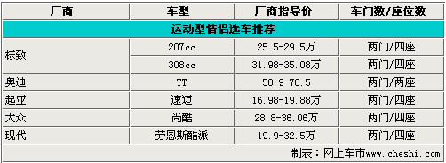 雙門跑車歷來是“小資”消費者們的首選,時尚的外觀和出色的動力性能足以讓您身邊喜歡運動、追求速度感的美女感到興奮。下面網上車市為您選取了308cc、奧迪TT、速邁、尚酷、勞恩斯酷派等熱銷雙門跑車。