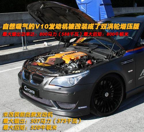 G – Power打造的這款M5是以老款的M5為基礎(chǔ),在本已經(jīng)非常強(qiáng)大的V10發(fā)動(dòng)機(jī)倉(cāng)中加裝了兩個(gè)渦輪增壓器,通過(guò)一系列的電腦以及油路等相關(guān)調(diào)校,讓老款的M5的動(dòng)力性甚至超過(guò)了V12發(fā)動(dòng)機(jī)。超過(guò)370km/h的最高時(shí)速比拼F1賽車。