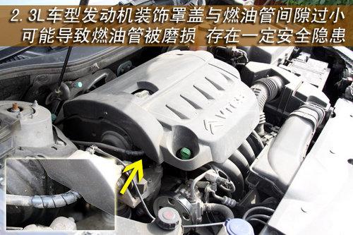 從圖中我們可以清晰的看到,發(fā)動(dòng)機(jī)裝飾罩蓋確實(shí)與燃油管保護(hù)套相接觸,在車輛啟動(dòng)后,由于發(fā)動(dòng)機(jī)溫度較高,燃油管保護(hù)套橡膠致使有所軟化,并且發(fā)動(dòng)機(jī)震動(dòng)與其摩擦,可能會(huì)導(dǎo)致燃油管被磨損,存在著一定的安全隱患。