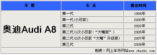 Audi A8是奧迪汽車的豪華旗艦車型,與其競爭對手梅賽德斯-奔馳S級以及寶馬7系相比,奧迪A8還很“年輕”。說起A8的歷史,自1994年推出至今僅有十余年,但不得不承認(rèn)的是奧迪A8成長的很快,從低調(diào)到張揚大膽的創(chuàng)新設(shè)計引領(lǐng)了豪華轎車的發(fā)展方向。下面我們就一同來了解下這款“年輕”旗艦車型的歷史。