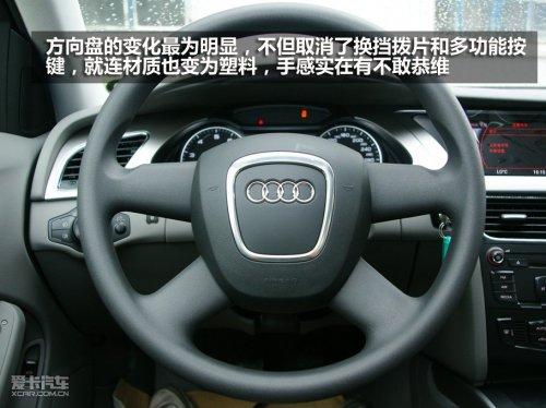 內(nèi)飾中方向盤的變化最為惹眼,在取消了換擋撥片以及方向盤多功能按鈕之后,A4L政府公務版的方向盤讓人覺得光禿禿的,有戲不習慣。另外方向盤不再是真皮包裹,而改為了手感較軟的一體式塑料方向盤。雖然塑料的材質(zhì)已經(jīng)算得上優(yōu)異,但手感相比真皮還是有些不敢恭維。