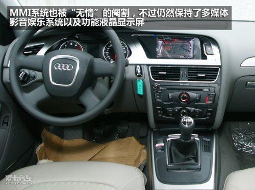 MMI多媒體影音導航系統(tǒng)也被閹割,排擋桿后面空空的塑料飾板顯得有一點點刺眼。不過音響系統(tǒng)與更高版本相比并無變化,而自動空調(diào)則取消了雙溫區(qū)劃分功能。不過無論是面板材質(zhì)還是整體制造工藝,完全保留了奧迪嚴謹豪華的風格,質(zhì)感強烈的同時裝配嚴絲合縫,旋鈕的阻尼力度也十分適中。
