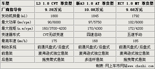 帝豪EC7的最大功率高于其他兩款車型,并且配備了五速手動(dòng)變速箱,能擁有185km/h的最高車速是比較正常的。相對(duì)而言,奇瑞A3的動(dòng)力優(yōu)勢(shì)并不明顯,再配備四速自動(dòng)變速箱,動(dòng)力和經(jīng)濟(jì)性也明顯不如其他兩款車型。比亞迪L3的發(fā)動(dòng)機(jī)雖然功率比較小,但CVT無(wú)級(jí)變速箱給這款車加分不少,而且通風(fēng)盤式制動(dòng)也不遜于其他產(chǎn)品。