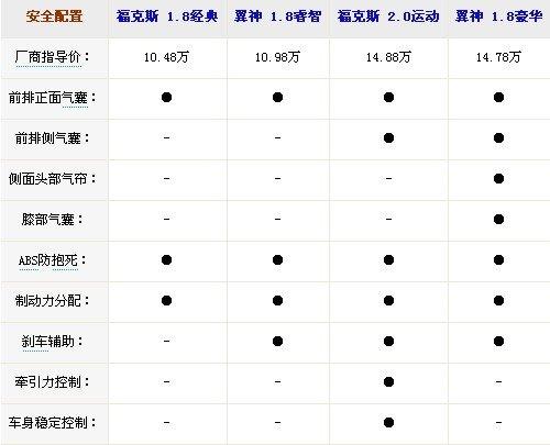 在安全配置方面,兩車的入門(mén)版車型基本保持在同一水平,正副駕駛雙安全氣囊和ABS+EBD也是目前主流的入門(mén)車型安全配置。而在較高配車型上,?怂乖谥鲃(dòng)安全上有一定優(yōu)勢(shì),其運(yùn)動(dòng)版車型擁有牽引力控制和電子穩(wěn)定程序。翼神則在被動(dòng)安全性上出色一些,側(cè)面頭部氣簾僅出現(xiàn)在?怂谷龓廊A型上,而全系標(biāo)配的膝部氣囊在?怂沟娜刀紱](méi)有配備。