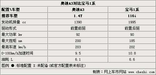 與奧迪剛剛在國內(nèi)投放的1.4T引擎的A3相比,寶馬116的發(fā)動機(jī)動力方面與1.4T的奧迪A3基本相當(dāng)。兩款車型的各項技術(shù)參數(shù)例如加速時間、油耗表現(xiàn)也處于相近的水平上,可以說BMW 116i恰好可以在價位以及動力上滿足消費者的需求。目前奧迪A3 1.4T入門車型的價格是26.8萬元,如果未來BMW 116i的官方定價與我們的預(yù)測接近,那么25萬元左右的價格加上2.0升排量和后輪驅(qū)動,絕對稱得上是奧迪A3的勁敵。