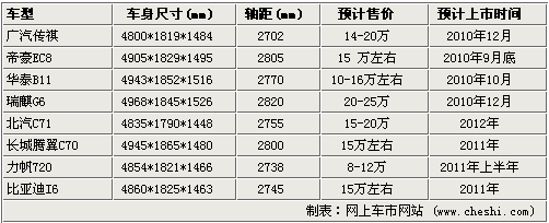 從上表可以看到,這八款新車型瑞麒G6的尺寸最大,車長2968mm、軸距達(dá)2820mm,其次是長城騰翼C70,而最先推向市場的很可能是帝豪EC8,預(yù)計售價15萬左右,搭載2.0L和2.4L發(fā)動機(jī)。剛剛下線的傳祺將于廣州車展上市,預(yù)計售價14-20萬元之間。