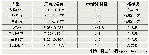 通過以上表格,我們可以清楚的看出,7款車當(dāng)中,除了上市時間比較久的海馬歡動和力帆620以外,其他幾款車型都僅有小幅度降價或不降價。由于幾款車型剛剛上市不久,所以我們對它們價格優(yōu)惠的期望也并不大。