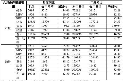 江淮汽車9月6日晚間發(fā)布2010年8月份產(chǎn)銷快報(bào),公司8月份總產(chǎn)量為3.17萬(wàn)臺(tái),同比增長(zhǎng)7%;總銷量為3萬(wàn)臺(tái),同比增長(zhǎng)8%。公司1-8月累計(jì)總產(chǎn)量為29.54萬(wàn)臺(tái),同比增長(zhǎng)46.73%,總銷量為30.37萬(wàn)臺(tái),同比增長(zhǎng)52.6%。