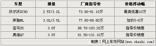 表中顯示清晰,沃爾沃XC90是四款車(chē)型中唯一一款出現(xiàn)優(yōu)惠的車(chē)型,三個(gè)版本全部?jī)?yōu)惠10萬(wàn)元,性價(jià)比表現(xiàn)比較突出;奔馳ML是四位對(duì)手中唯一一款加價(jià)車(chē)型,根據(jù)車(chē)型不同加價(jià)5-8萬(wàn)元。寶馬X5和奧迪Q7銷(xiāo)售情況相對(duì)穩(wěn)定,以廠商指導(dǎo)價(jià)銷(xiāo)售,但Q7 3.0TFSI等等時(shí)間較長(zhǎng),有5個(gè)月之多。