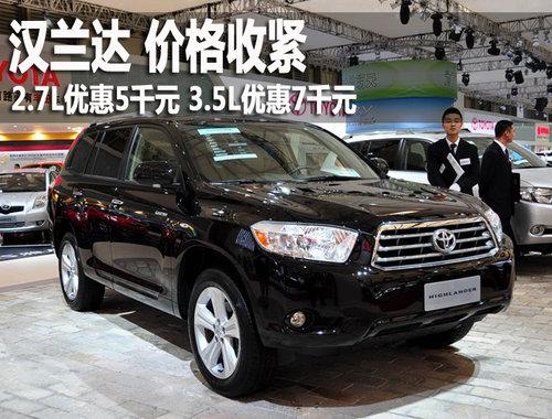 廣汽豐田生產(chǎn)的漢蘭達(dá)Highlander于2009年5月25日正式下線,擁有2.7L和3.5L兩個(gè)排量共10款車型,價(jià)格區(qū)間為24.88~42.98萬元。近期,編輯從北京廣汽豐田4S專營(yíng)店獲悉,漢蘭達(dá)現(xiàn)車充足,優(yōu)惠幅度有所縮水,現(xiàn)金讓利最高7千元。詳情見下表: