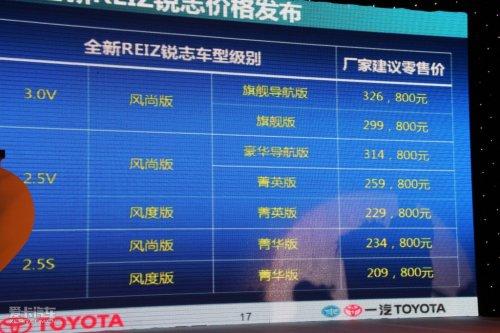 此次國產新一代豐田銳志推出了2.5L、3.0L兩種排量共計7款車型。其中2.5L排量的車型包括:2.5S風度菁華版、2.5S風尚菁華版、2.5V風度菁英版、2.5V風尚菁英版、2.5V風尚豪華導航版;3.0L排量的包括:3.0V風尚旗艦版、3.0V風尚旗艦導航版。