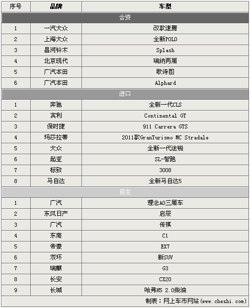從表中可以看出,在2010年第四季度(10-12月)共有23款新車將于消費者見面。合資品牌品牌共有6款車型登場,上海大眾的全新POLO和廣汽本田的歌詩圖是關(guān)注度相對高的兩款明星車型;進(jìn)口陣營中奔馳全新CLS已經(jīng)被炒得非常火熱,而售價低很多的起亞SL-智跑則會引起共多SUV愛好者的注目;自主幫派以9款新車雄居榜首,第四季度這部分的特點在于有全新的品牌加入戰(zhàn)局,廣汽、東風(fēng)等合資品牌都將下一步的計劃投身到自主品牌的浪潮之中。