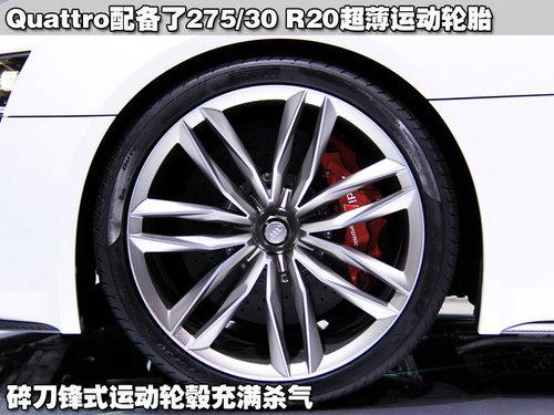 一款以“跑”見長的車,必須擁有一雙好鞋,奧迪Quattro概念車配備了275/30 R20超薄運(yùn)動(dòng)輪胎,紅色卡鉗自然是必備的配置。最讓人感到震撼的便是奧迪Quattro概念車配備的7幅式雙條紋碎刀鋒式輪轂,造型動(dòng)感十足,給人它可以將所有路面斬碎,跑在第一的位置。