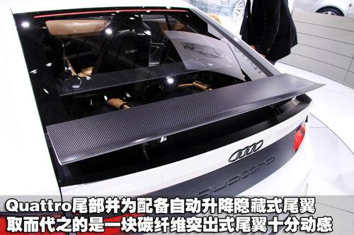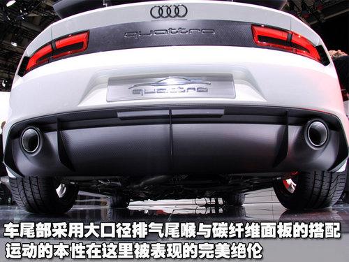 車尾部奧迪Quattro概念車除了車漆意外,基本全部被碳纖維包裹,甚至武裝到了排氣尾喉上,全碳纖維后保險(xiǎn)杠的風(fēng)格讓車輛的運(yùn)動(dòng)感瞬間提升了一個(gè)檔次。