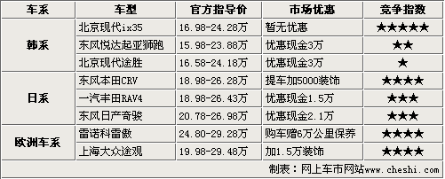 通過上表列出了8款比較熱銷的SUV車型,可以看出,主要競爭對手CRV和ix35 均無優(yōu)惠,CRV銷售方式依然高調(diào),購車需加裝飾。其他韓日車系,優(yōu)惠幅度都在1.5萬元以上,其中獅跑和途勝最高優(yōu)惠高達3萬元,另外大眾品牌的途觀也是供不應(yīng)求,購車需加1.5萬元裝飾。權(quán)衡哪一款SUV最適合自己、最具性價比,才是消費者最為關(guān)注的,下面就詳細為大家介紹一下。
