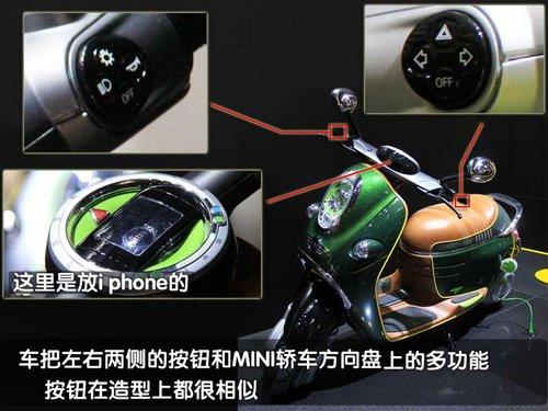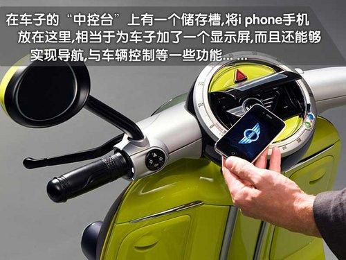 MINI Scooter E概念車(chē)將i phone手機(jī)與電動(dòng)車(chē)融合,通過(guò)位于車(chē)輛頂端的專(zhuān)用接口。車(chē)主的i phone手機(jī)可以放置于其中,與車(chē)輛的音響和信息與了系統(tǒng)實(shí)現(xiàn)最大化的兼容。此外,還有一項(xiàng)有趣的功能,可以通過(guò)谷歌地圖來(lái)顯示其它騎車(chē)者的位置,甚至可以發(fā)出結(jié)伴而行的邀請(qǐng)。