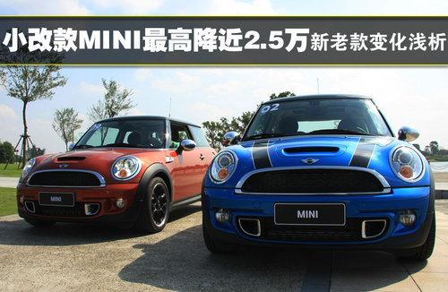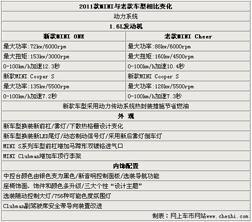 2011款MINI并非全新?lián)Q代車型,為中期改款。主要的配置變化體現(xiàn)在外形設(shè)計(jì)、動(dòng)力系統(tǒng)以及內(nèi)飾三大方面。售價(jià)22.5萬元的MINI ONE與老款的MINI Cheer相比在發(fā)動(dòng)機(jī)功率方面下降了16KW,而新款MINICooper s發(fā)動(dòng)機(jī)功率則提升7KW換來的是快0.1秒的百公里加速時(shí)間。在配置方面,新款車型于老款車型相比略有提升,但是并不明顯,主要變化還是體現(xiàn)在設(shè)計(jì)方面 。