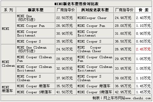 新上市的2011款MINI在車型上分部上仍為10款(老款包括50周年紀(jì)念版在內(nèi)為12款)。其中,MINI One和MINI One Clubman首次進(jìn)入中國(guó)市場(chǎng)銷售,取代之前MINI Cheer成為了新的入門級(jí)車型。通過上表我們可以清晰的看出,2011款MINI在售價(jià)方面普遍低于老款車型,兩款入門級(jí)車型的售價(jià)差最高達(dá)到了2.45萬元。而最低的價(jià)差也接近萬萬元。那么,售價(jià)的降低會(huì)不會(huì)在配置方面有縮水的情況呢?