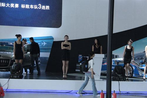 接下來看到的是標(biāo)致展臺(tái),模特已經(jīng)嚴(yán)陣以待,進(jìn)入了彩排階段,正式服裝已經(jīng)上身,黑色的套裙裝體現(xiàn)性感的一面。美女們站一排,有點(diǎn)眼花繚亂啊。