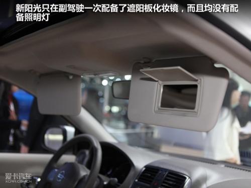 新陽光的音響控制面板設(shè)計(jì)十分傳統(tǒng),布局與按鍵都與現(xiàn)在主流的日產(chǎn)車型一致,并沒有什么新鮮感。倒是圓形的自動(dòng)空調(diào)控制面板設(shè)計(jì)的非?蓯郏切玛柟鈨(nèi)飾的一大亮點(diǎn),而且操作起來沒有任何難度。新陽光只有副駕駛位置配備了遮陽板化妝鏡,而且沒有配備照明燈,讓人有些不解。