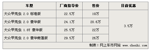 據(jù)4S店銷(xiāo)售人員介紹:目前甲殼蟲(chóng)全系可優(yōu)惠3.5萬(wàn)元,2.0標(biāo)準(zhǔn)版售價(jià)僅為19萬(wàn),但目前硬頂版甲殼蟲(chóng)無(wú)現(xiàn)車(chē),訂車(chē)需等半個(gè)月至兩個(gè)月。敞篷版目前現(xiàn)車(chē)較充足,喜歡的朋友可以不必等待漫長(zhǎng)的訂車(chē)時(shí)間。