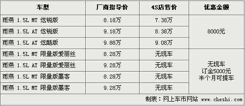 長安鈴木雨燕是小型車型中最受歡迎的一款之一,在推出限量版車型后,雨燕從整車的外觀和內(nèi)飾的風(fēng)格上更具個(gè)性化,時(shí)尚化,滿足了都市年輕80后的喜愛。根據(jù)網(wǎng)上車市價(jià)格監(jiān)測(cè)系統(tǒng)顯示,目前雨燕全系最高能優(yōu)惠現(xiàn)金8000元,限量版車型則需要預(yù)訂,具體車型以及價(jià)格如下: