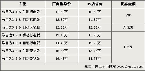 據(jù)長安馬自達(dá)4s店銷售人員介紹,除了4月份上市的1.6L馬自達(dá)3自動天窗版沒有優(yōu)惠外,其余車型均有優(yōu)惠,最高達(dá)到了1.5萬元。馬自達(dá)3的1.6L車型有1萬元的優(yōu)惠,經(jīng)優(yōu)惠后全系入門級的1.6L手動標(biāo)準(zhǔn)版售價(jià)從11.80萬元降到了10.80萬元。馬自達(dá)3的2.0L車型有1.7萬元的優(yōu)惠,經(jīng)優(yōu)惠后全系最高配的2.0L自動豪華版售價(jià)跌破了15萬元,僅售14.78萬元。
