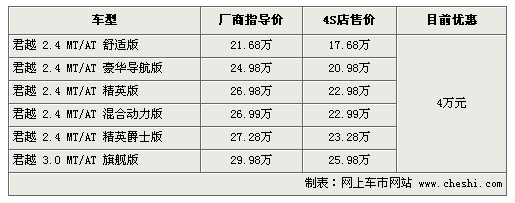 據(jù)4S店銷售人員介紹:由于新君越臨近上市,所以目前銷售的君越有大幅降價,最高降幅達到4萬元。目前除了混合動力版需預定外,其他車型貨源充足,全系優(yōu)惠4萬元;旌蟿恿Π骖A訂需等一個月時間,訂金1萬元。
