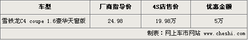 據(jù)4S店銷售人員介紹,目前銷售的C4轎跑車只有頂配1.6豪華天窗版,店內(nèi)有銀色和紅色現(xiàn)車供應(yīng),數(shù)量有限。頂配版原來廠商指導(dǎo)價格為24.98萬元,現(xiàn)在售價僅為19.98萬,直降5萬元現(xiàn)金,車價不足20萬元。